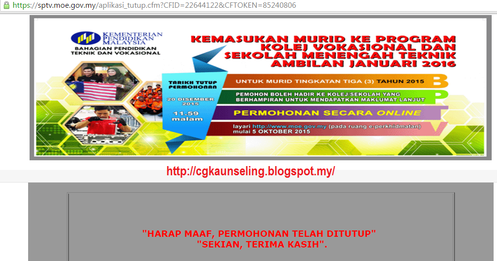 Menerusi makluman rasmi kementerian pendidikan malaysia (kpm), permohonan kemasukan ke kolej vokasional dan sekolah menengah teknik kini sudah dibuka mulai 5 oktober 2015 sehingga 20 disember 2015. Link permohonan kolej vokasional dan sekolah teknik 2017: Permohonan online ke program kolej vokasional untuk tahun 2016 sudah dibuka bermula 2 mei 2016. Semakan kemasukan ke program kolej vokasional dan sekolah menengah teknik ambilan 2016 kini boleh dilakukan bermula 18 sehingga 25 januari 2016 menerusi laman web kementerian pendidikan malaysia. Borang permohonan kemasukan ke kolej vokasional (kv) dan sekolah menengah teknik (smt) 2016 kpm secara online.