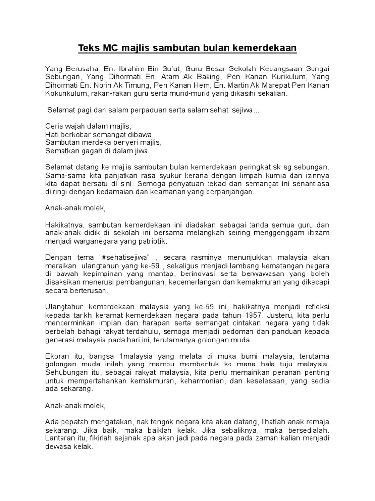 Teks Pengacara Majlis Hari Guru from imgv2-1-f.scribdassets.com Majlis perpisahan persaraan saya dengan rasminya telah dibuat oleh pihak sekolah menengah kebangsaan sultan ibrahin satu, 17000 pasir mas, kelantan pada 28 februari, 2013 ( khamis ), bertempat di dewan besar sekolah yang bermula pada jam 12.00 tengah hari hingga jam 2.00 petang. Teks mc jamuan akhir tahun perpisahan. Teks pengacara majlis majlis perpisahan jan 2018. Projek video persaraan khas sempena majlis persaraan puan tengku pada 23 oktober 2019. .teks pengacara majlis kasih disemai bakti dituai sempena persaraan tuan hj mawardi pagi yang indah penuh ceria. Teks pengacara majlis perhimpunan rasmi mingguan rasmi. Majlis perpisahan sempena persaraan yang diraikan puan bedah bt lahman, pen. Assalamualaikum tuan, mohon izin share teks tuan ye.