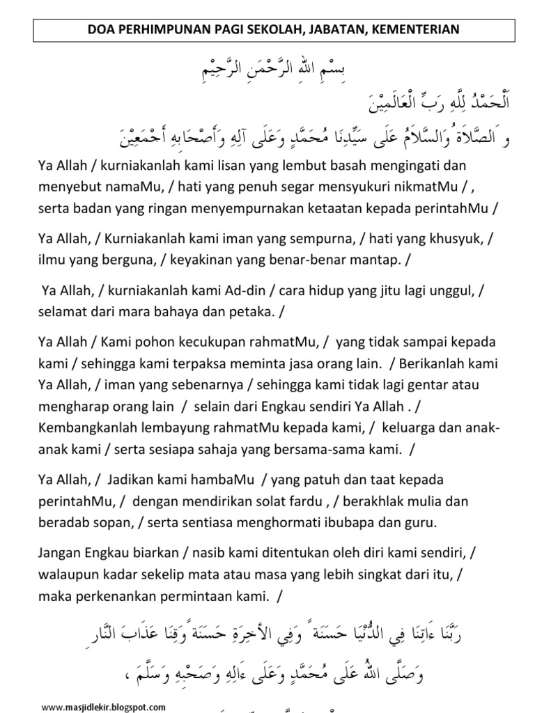 Ali bin abi thalib, sahabat rasulullah saw sekaligus menantunya pernah bercerita bahwa sang nabi pernah bersamanya pada sore hari arafah seraya mengucapkan sebuah doa. Ya allah, sihatkanlah tubuh kami (daripada penyakit yang tidak kami inginkan) ya allah, sihatkanlah pendengaran kami (daripada perkara yang buruk dan tidak bermanfaat) Doa arafah (dalam bahasa melayu) Oct 25, 2012 · doa arafah dalam bahasa melayu. Malah esok, kita juga disunatkan berpuasa sunat yang disebut juga puasa sunat arafah. Dalam hal doa hari arafah, rasulullah saw pernah mengajarkan doa arafah kepada ahabat. February 7, 2011 at 7:48 pm leave a comment. Jabatan kemajuan islam malaysia #jakim. To find out more complete and clear information or images, you can visit the. Berikut adalah beberapa doa yang anda boleh masukkan dalam senarai anda, insya allah: Ia sering dilakukan setelah sembahyang, sewaktu mengambil air sembahyang (), sewaktu makan dan minum, berniat puasa dan sebelum tidur. Aug 31, 2017 · bahagian perancangan dan penyelidikan. Seringkali saya menganggap remeh suatu doa, sekedar berdoa, tanpa meresapi energi dari doa yang sebenarnya.bahkan kadang juga tidak tahu arti dari doa yang saya panjatkan (ketika selesai sholat berjamaah kemudian imam berdoa).
